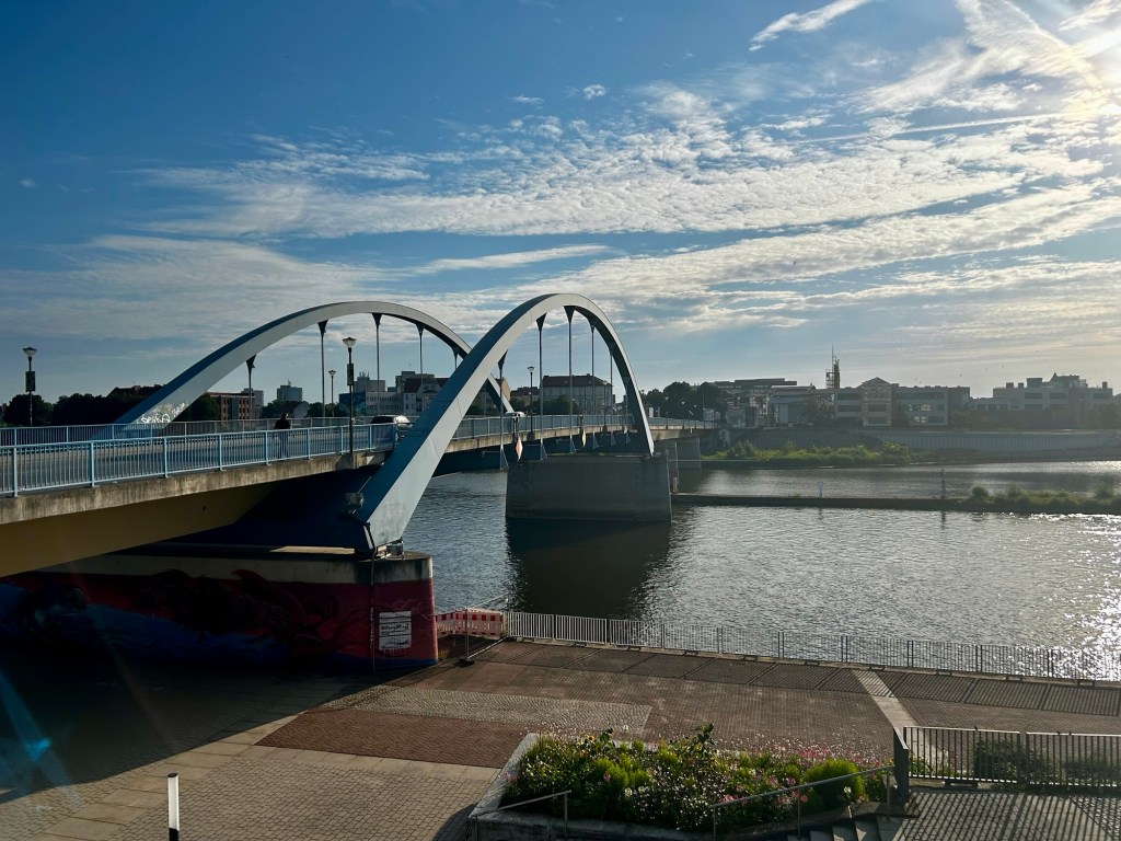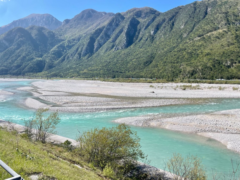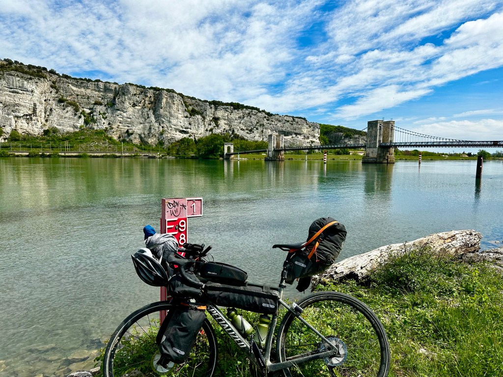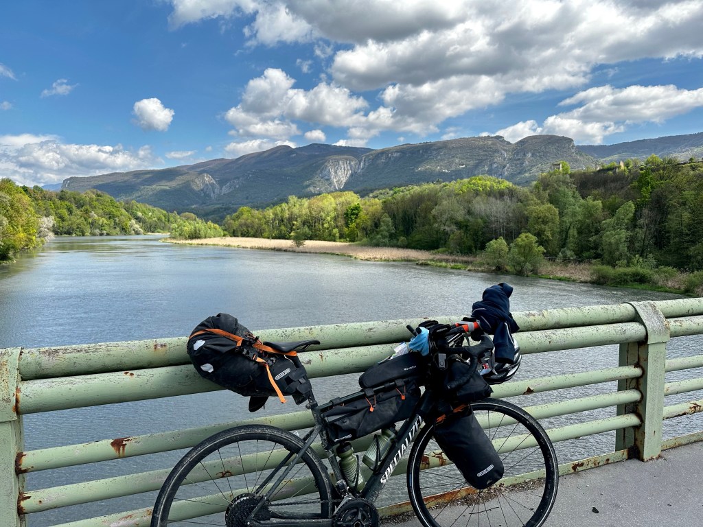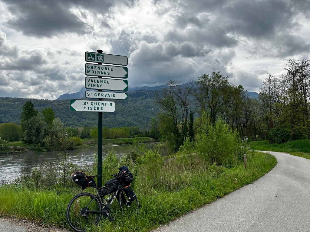 Schönes Städtchen. Allerdings wollten Jugendliche mein Handy abziehen, als ich drauf schaute. Hier in Frankreich sind diese sehr schnellen und größeren E Roller modern. Die Dinger sind schneller als Fahrräder. Jedenfalls kamen zwei Rotzer auf einem Roller von hinten auf mich zu gefahren und als Sie ganz knapp bei mir waren, wollte der hintere der beiden mein Handy schnappen, zum Glück habe ich es ne Sekunde vorher gecheckt. Aber die beiden wären weg gewesen. Da hilft auch kein hinterherlaufen. Auch die Dealer an den Häuserecken habe alle so einen E Roller. Bei Grenoble, direkt an der Isere. Da ist wieder das Gefühl der Dankbarkeit für alles selbstverständliche. Wie kann ein Mensch so leben? Heute habe ich mir viel vorgenommen. Ich bin 7 Uhr gestartet! Und möchte bis nach Valence. Das wären ca. 130 km Diese Landschaft ist unglaublich schön. Das nächste Bild ist unten auf der Brücke entstanden.