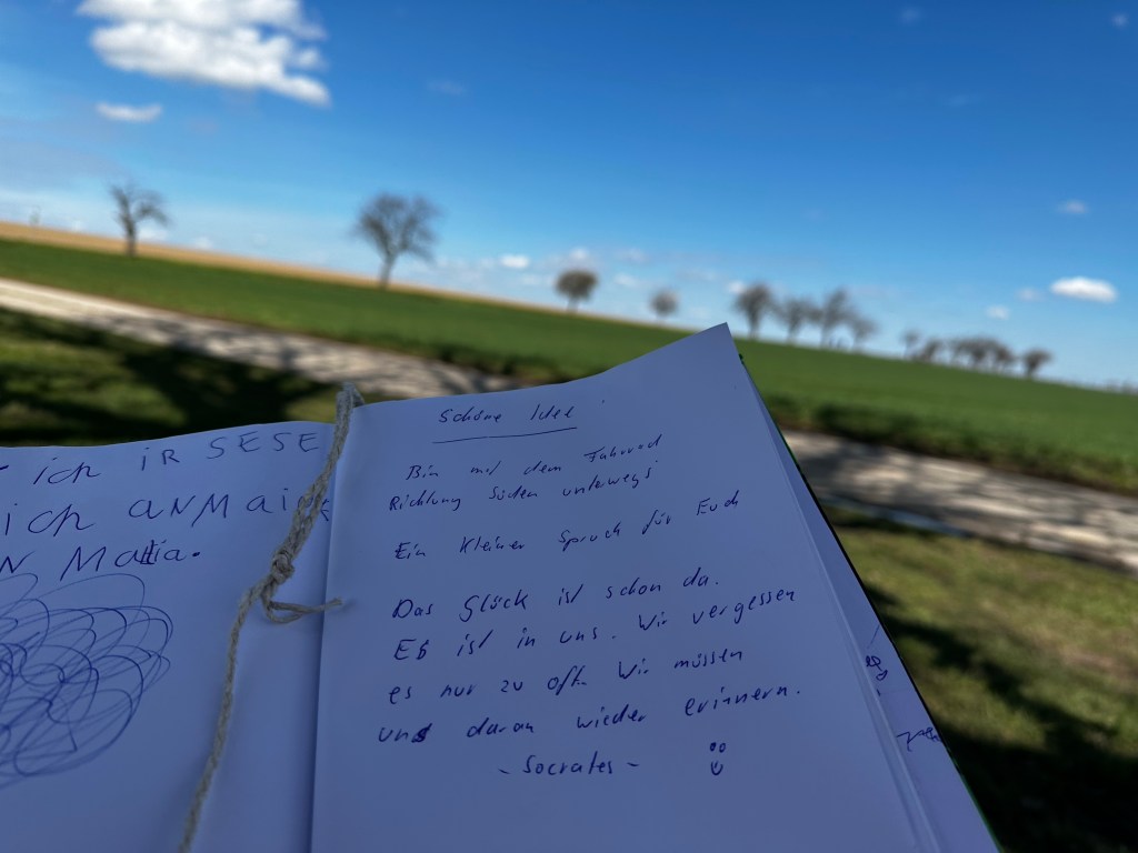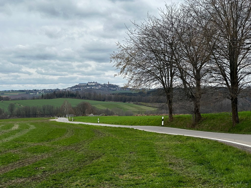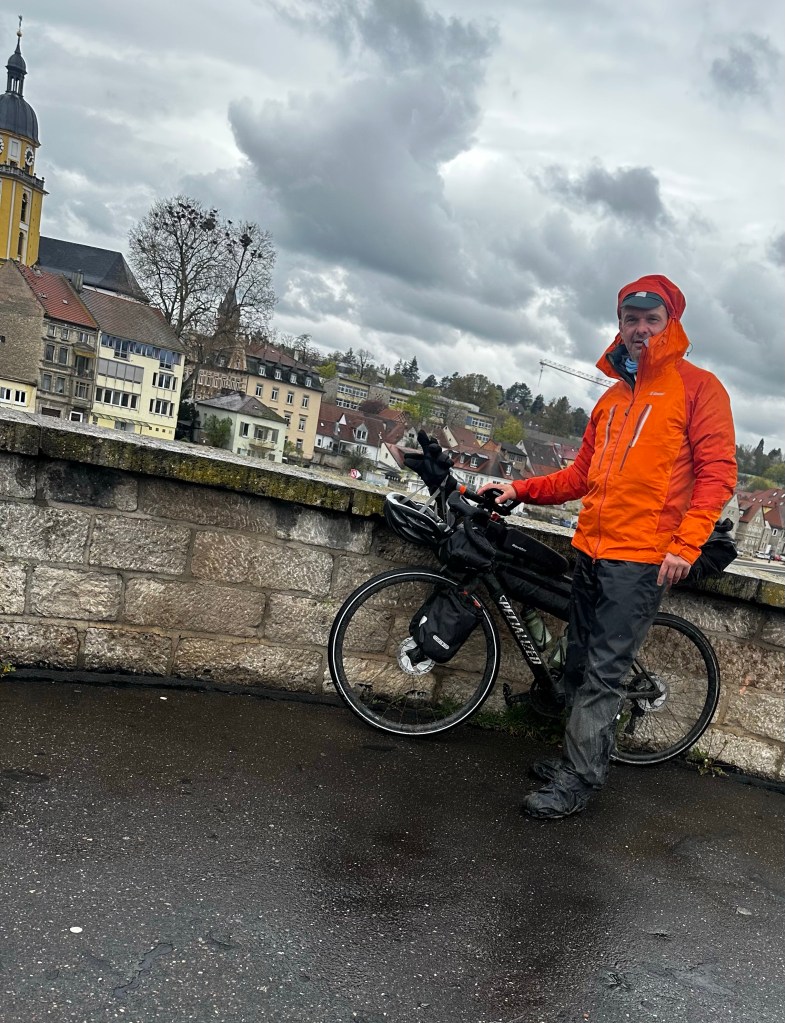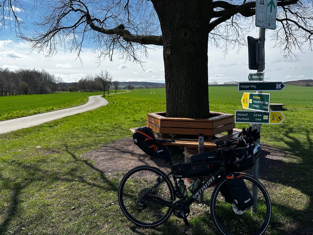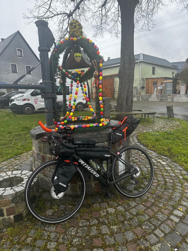 Erste Rast unter einer alte Eiche. Schöne Idee. Selbstverständlich gab es einen Eintrag von mir. Langsam werde ich nachdenklicher. Erste Bordsteingala des Jahres . War dringend notwendig. Ich habe alles sofort weggeatmet. 😳Nach 60 km ist das Tagesziel erreicht. Die Silberstadt Freiberg. Der eisige Wind , die Höhenmeter, der Regen, ein Streit auf Arbeit, meine fehlende Fitness und meine Bronchitis waren heute noch Widersacher. Ich muss erstmal in den Flow kommen. Das kann noch ein paar Tage dauern. Irgendwie, bin ich innerlich noch nicht losgefahren. Komisches Gefühl. Trauriges Gefühl. Da dachte ich als erstes, ja Pädagoginnen und Pädagogen sollten dies auch haben. Dann dachte ich, es gibt auch noch mehr Berufe, wo eine gehörige Portion Kindheit nützlich ist oder wäre. Auf dem Weg nach Chemnitz lief mir Herbert in die Arme. Nach eigener Aussage wartet er auf Touristen wie mich, um Sie voll zu quatschen. Herbert zeigte mir die Augustusburg aus der Ferne. Als die Krone des Erzgebirges. In Oederan wo wir uns begegnet sind, ist der Eingang zum Erzgebirge. So zumindest ist es die Meinung von Herbert Kluge aus Oederan. Das ist die Krone des Erzgebirges. Schloß AugustusburgDie Zschopau. Und ein geiles Rad. Einige Straßensperren machten mir das Leben heute schwer. Ich musste dadurch einige Umleitungen fahren Und das war mit Sicherheit Absicht . Aber selbst ist der Mann. Da musste der Bauzaun weichen. Auf ca. 500 m Höhe. Heute war es extrem kalt . 4 Grad und dieser eisige Wind dazu . Natürlich meist direkt von vorn. Nach 105 anstrengenden Kilometern bin ich in einer kleinen Absteige in Rodewisch/Vogtland gelandet. Für 49€ gibts es sogar Frühstück morgen. Da hier alles schon zu hat, ist das wohl heute mein Abendessen. Aber ich liebe die einfachen Dinge und nach so einer Tour schmeckt alles doppelt so gut. Früh 8 Uhr . Ohne Frühstück gehts durch Auerbach. Aber ein Netto ist in Sicht Es regnet und regnet bei romantischen 3 GradUm 11 Uhr musste ich einen Stopp machen . Die Regenjacke schafft es nicht mehr . Ich bin total durchgefroren. Erstmal in einem Bistro ausgebreitet um alles zu trocknen. Wenn ich es heute bis nach Hof schaffe, bin ich zufrieden. Im Vogtland findet man viel österlichen Schmuck. 3 Grad und Regen eben . Heute ist ein Kampftag. Nur überstehen! Auf gehts nach Bayern Wegzehrung. Gesund ist anders. Neues Patent für das trocknen von klitschnassen Socken . Nach 80 km Kampfleistung im Dauerregen, war leider nur noch ein Zimmer frei, in ganz Helmbrechts spontaner Luxus . Auch nicht schlecht. Die heise Dusche war der Hanmer, nach so einem Tag. 🥶