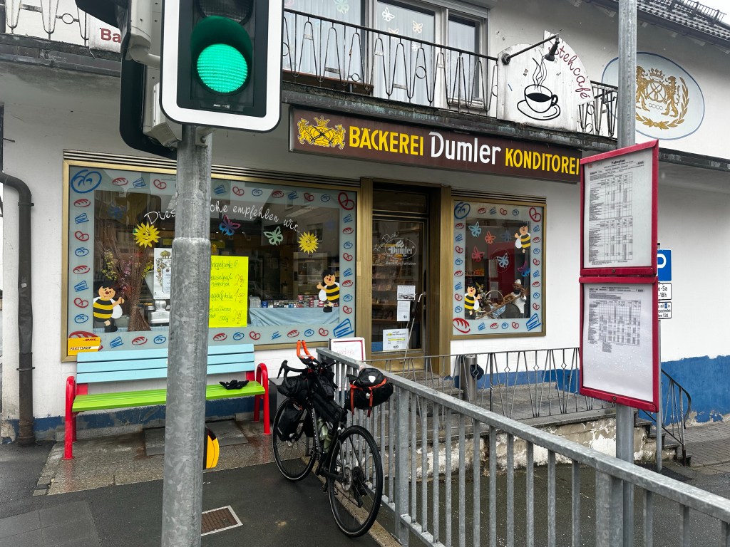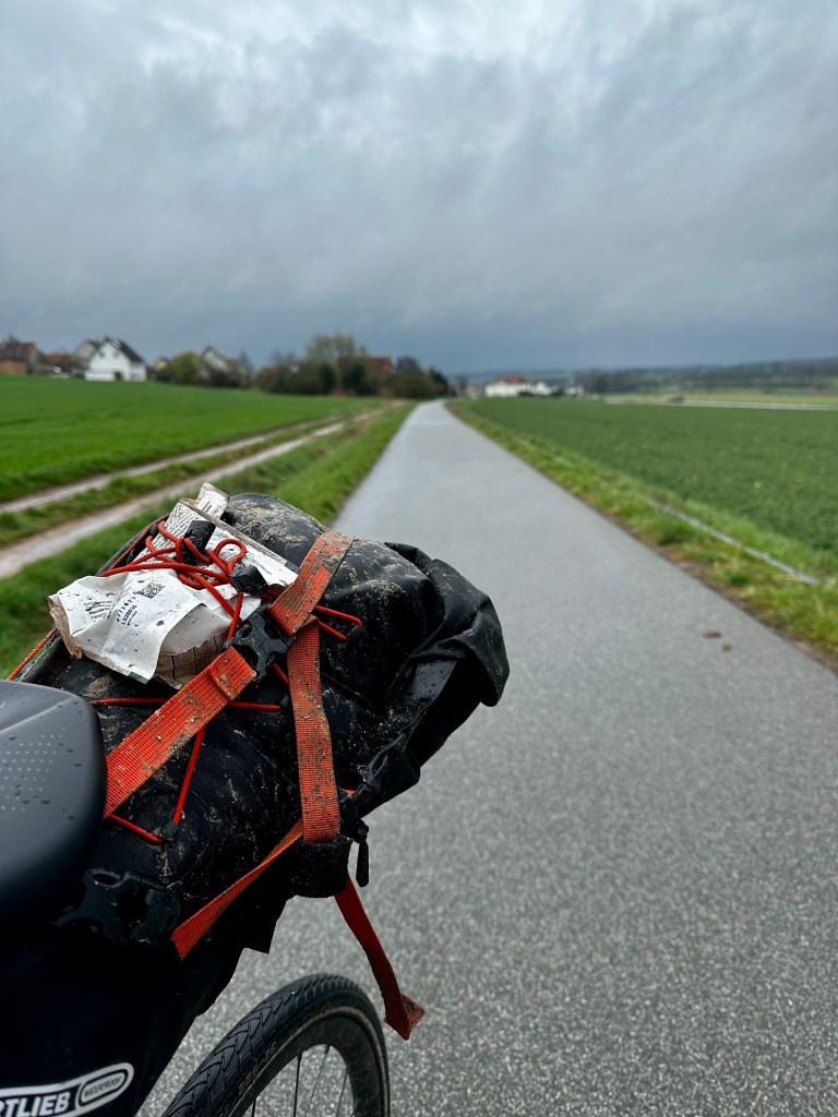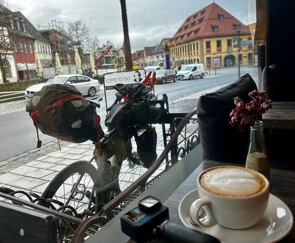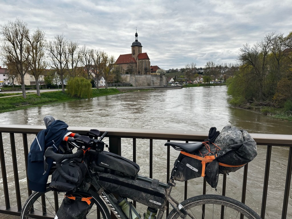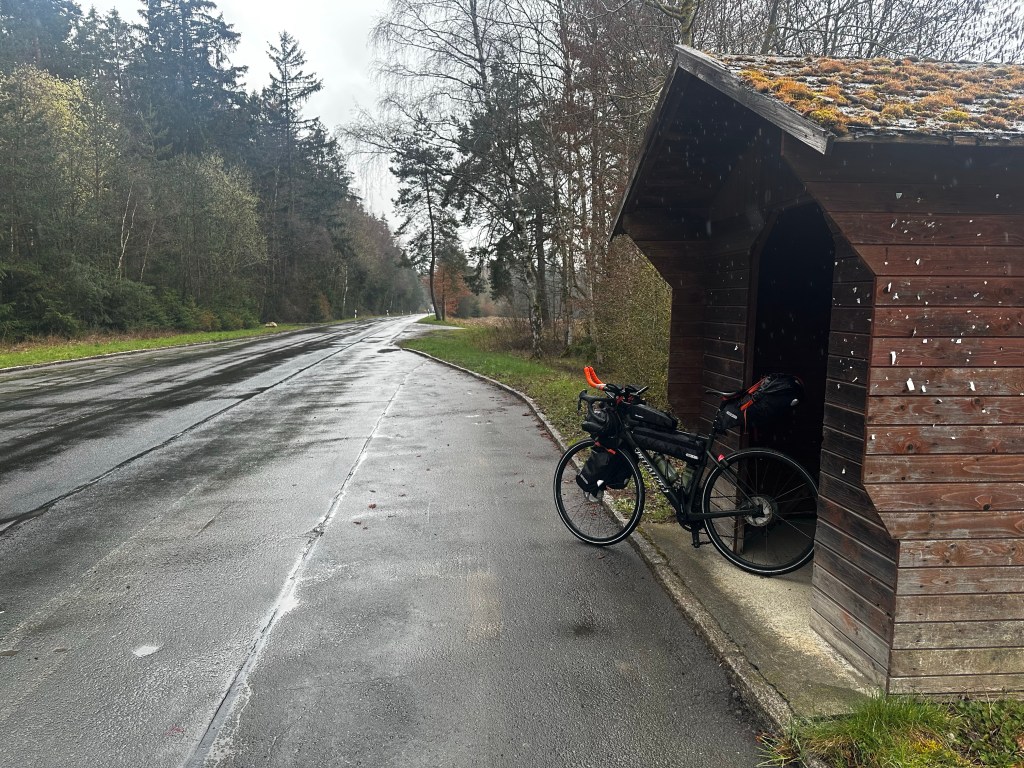 Ich habe alles an, was ich mit habe. In dieser Bäckerei erhielt ich Asyl im PausenraumWie früher . Als wäre die Zeit stehen geblieben. Natürlich wird hier ordentlich geraucht! Kulmbach ist erreicht. Nach 3,5 h Fahrt im kalten Regen. Es waren nur 30km . Das sagt alles . Matschige Wege. Schwierig zu fahren bei der NässeEin trockener Moment . Mehr wie 3 Grad gab es heute draußen nicht . Alles durchgeweicht. Keine einzige trockene Klamotte außer ein paar Socken. Alles andere pitschnass. Für das studentische Zimmer hier, musste ich 93€ löhnen. Natürlich ohne Frühstück 😳. Die Küche ist auch schon zu. Zum Glück habe ich noch Gummibärchen. Aber nach den heutigen 100 km war mir das Wurscht . Hier in Breitengüssbach ( kurz vor Bamberg) gibt es nichts anderes. Hoffentlich wird das Wetter morgen besser. Eigentlich ganz nett hier. Wie der Tag gestern geendet ist, so begann es heute wieder, mit Regenwetter. Einsam ist es an einem drüben Sonntag in Bayern. Schlecht zu fahren bei der Nässe. Ist klitschiger als es auf dem Bild aussieht. Matsch und kleine glatte Steine Ein schönes WeinStädtchen Prichsenstadt. 15 Uhr bekam ich endlich einen guten Kaffee Kitzingen am Main. Es regnet immer noch.
