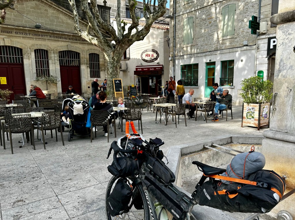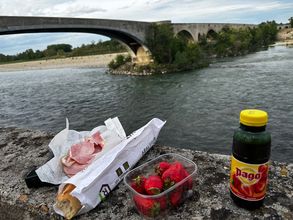 Diese kleinen Läden sind die besten Das ist mal ein MacaronAbendstimmung kurz vor Valence. Abends 20 Uhr komme ich endlich in Valence an. Nach besagten 130km. Der Ritt war wichtig heute. Donnerstag Abend oder Freitag Mittag möchte ich in Avignon sein. Das ist Fred. Mit ihm bin ich ca. 40 km heute früh zusammen gefahren. Er ist Franzose und auf dem Weg nach Nizza. Sein Bike wiegt mit allen 60 kg und es fährt bis zu 45 kmh. Er selbst wiegt 67 kg. Er hat alles dabei. Alles!. War aber nett mit ihm zu plaudern. Wir haben uns auf englisch unterhalten. Sein Englisch war schlecht und meins auch. Da passte es! 🥳. Im übrigen muss ich fast genau soviel bewegen wie Fred, nur dass mein Fahrrad nur 23 kg mit allem wiegt. 😱Unglaublich schöne Hängebrücke über die RhoneHeute geht es sehr gut voran. Leichter Rückenwind und bestes Radfahrwetter ( 23 Grad) ☀️ . Ich will heute nur nach Pont Saint Esprit. Dort habe ich mir schon mal ein billiges Zimmer reserviert. Ca. 110 km Hatte ich erwähnt, dass ich Bordsteingalas so liebe 🧡.Nach 110 km ganz entspannt in Pont Saint Esprit angekommen. Heute war es wie Urlaub. Morgen gehts nach Avignon. Im übrigen ist das mein drittes Cap auf dieser Reise. Schon zwei verloren. Aber bei der Sonne brauch ich unbedingt eins für die Glatze 😇In diesem kleinen Hotel bin ich für 60€ untergekommen. Früh 7:30 Uhr war Start. Ich will bis Mittag in Avignon sein. 60 flache KmKurz vor Avignon. Gehts los. Insgesamt 5 Pannen haben mich unglaubliche Nerven gekostet. Nach endlosen 5 Stunden Eigenreparaturversuche anschließenden 6 km Fußmarsch mit einem kaputten Bike habe ich endlich eine kleine Werkstatt gefunden. Kompletter Austausch vom Reifen und Reparatur des hinteren Laufrades. 18 Uhr war alles wieder gut. Aber das hat Energie gekostet!