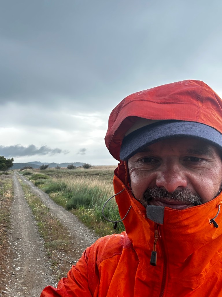 In diesem Hotel habe übernachtet. War auch gut so, denn es regnet und es stürmt. Gegensturm. Da ist sogar das schieben echt eine Herausforderung Der Regen hört auf, der Sturm bleibt. Der schönen Landschaft tut es nichts. Aber alles wirkt ein bisschen schroff.Das ist was. Auf dem lehmigen Boden ist nach dem Regen kein richtiges Fortkommen.Kurze Rast Nicht fahrbar! Zu gefährlich. Die Böen sind unglaublich kräftig. Trotzdem auf den Weg machen. Langsam aber auf den Weg .
