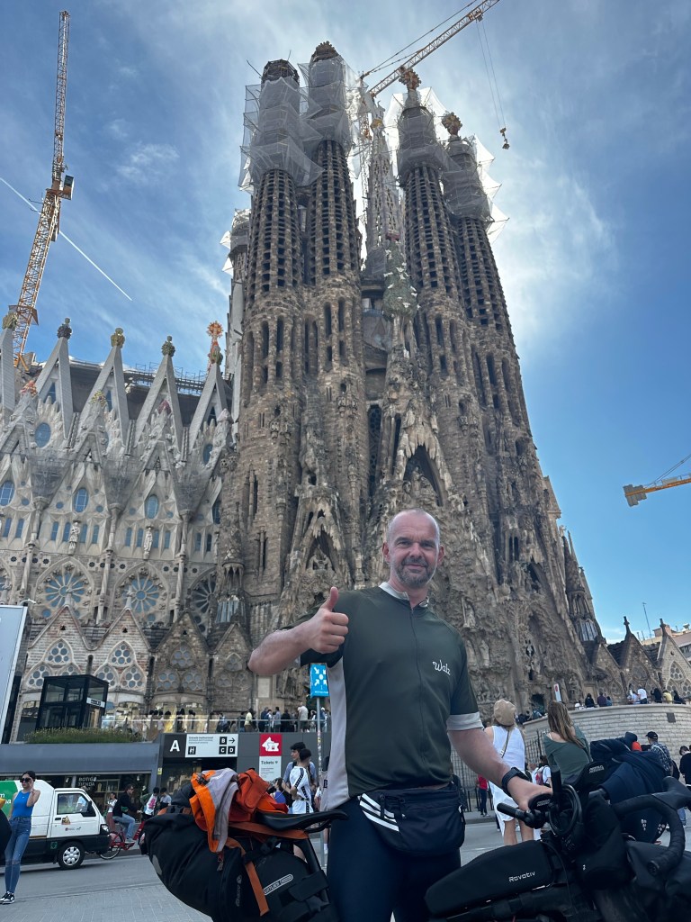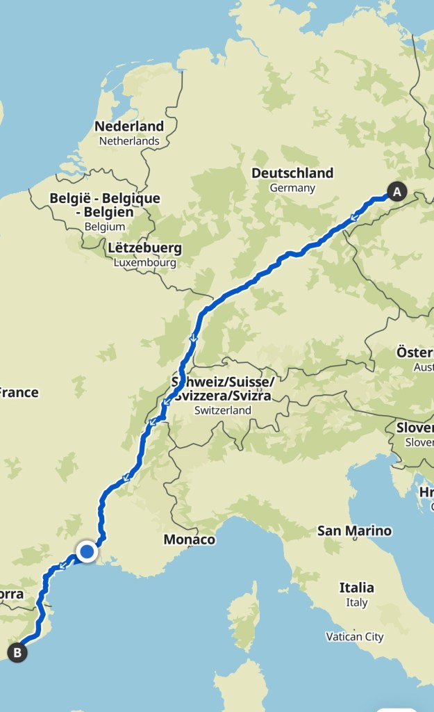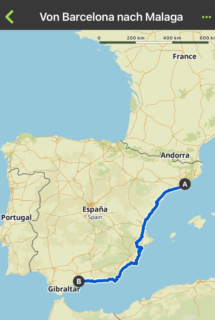 Wie auch immer, ich habe immer selbst genug Proviant dabei, so dass ich getrost durchfahren kann. Meine Erwartungen sind immer erstmal gering. Denn ich möchte immer frei und unabhängig bleiben. In l Escala einer Stadt an der Küste mache ich einen strategischen Stopp bis Morgen. Heute ist einfach wieder zu viel Wind und das fahren auf den Bundesstraßen ist wirklich sehr gefährlich. Die Windböen sind so stark, dass es so ist, als ob dir jemand unvermittelt während der Fahrt an das Rad tritt. Echt krass. Zumal mir heute der Helm geklaut wurde. Morgen möchte ich nach Girona und noch ein Stück weiter. Es sind noch 220 km bis Barcelona. Unabhängige Berichterstattung . So sieht’s in Spanien aus. Recht zeitig bin ich heute los. Um 6.30 war ich auf dem Rad. Da kam mir nach 25 km ein kleiner Markt ganz recht. Nach Girona führt ein Pilgerweg, der als Radweg seine Zwecke allemal tut. Da obligatorische Foto in Girona. Schöne Stadt und viel los. Irgendwie bin ich leicht überfordert. Ich hole mir was zu essen und mach eine Bordsteingala. Ein Kult in Spanien Nach dem ich in Saint Feliu Abends angekommen war, hatte ich noch Lust weiterzumachen. Ich fuhr im Sonnenuntergang die Serpentinen an der Costa Brava. Ein unvergessliches Erlebnis. Wunderschöne Ausblicke überall Gegen 21 Uhr erreichte ich mein Tagesziel Tossa de Mar. Für 33€ habe ich ne Unterkunft bei Booking.com gefunden. Morgen gehts nach Barcelona. Im übrigen habe ich kein Heimweh. Bin im Flow. Ich könnte noch viel länger fahren. Verrückt, vor 3 Wochen nicht so ganz vorstellbar gewesen. Gegen 6:30 Uhr bin ich gestartet. Ich liebe Sonnenaufgänge Ich glaube das wird mein neues Hintergrundbild am PC. So kann man mal frühstücken. Fast immer am Strand lang. Auf nach BarcelonaEine Straßenunterführung 😱. An diesem Ort habe ich lange gesessen. Noch 15 Kilometer, man erkennt die Skyline. Mir wurde bewusst, dass meine Reise nun zu Ende geht. Ein Gefühle von Wehmut, Freude und Stolz waren auf einmal da.So von der Frauenkirche bis zur Sagrada Familia sind es 2221 km und 21 Tage Die Tour im Groben.2221,5 km Gesamtstrecke.Anstiege 11513 hm, 65000 Gesamtkalorienverbrauch. Sagt zumindest Garmin.Start und Landung sozusagenDie Jungs sind nach einer unglaublichen 1750 km Tour mit dem Auto früh 6 Uhr in Barcelona angekommen. Nach einer kurzen Stadtbesichtigung haben wir uns auf den Weg in unser Quartier außerhalb der Stadt gemacht. Dort wollen wir bis Samstag Abend bleiben. Dann gehts zurück in die Heimat. Frühstück, Sonne und Erdbeeren 🍓. Mega ZeitNoch ein paar Kleinigkeiten beim Juwelier…als Mitbringsel für die Frauen zu Hause. Naja vielleicht war es nur ein schönes Geschäft für Accessoires. Und klar waren wir auch in der kalten Brühe. 16 Grad waren es wohl.Wir verlassen die kleine Idylle und machen uns auf den Weg . Mit dem Auto sind es 1750 kmAuf gehts. Ich danke Euch allen für eure guten Wünsche und für eurer mitfiebern . Dies hat mir bei meinem Reise oft geholfen . Bis bald 👋