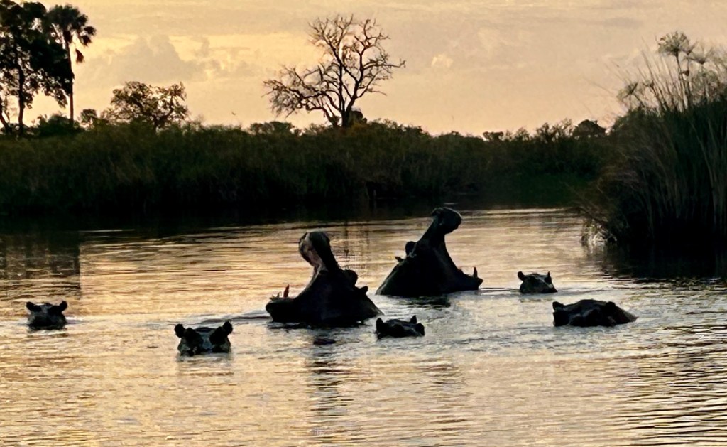 In der Dunkelheit dürfen wir nicht die Lodge allein verlassen, zum Essen werden wir eskortiert. Viele Tiere sind hier. Tatsächlich so nah. Der alte Knabe ist 2m vor uns. Er ist satt! Zum Glück.Heute hatten wir mehr Glück mit den Hippos.