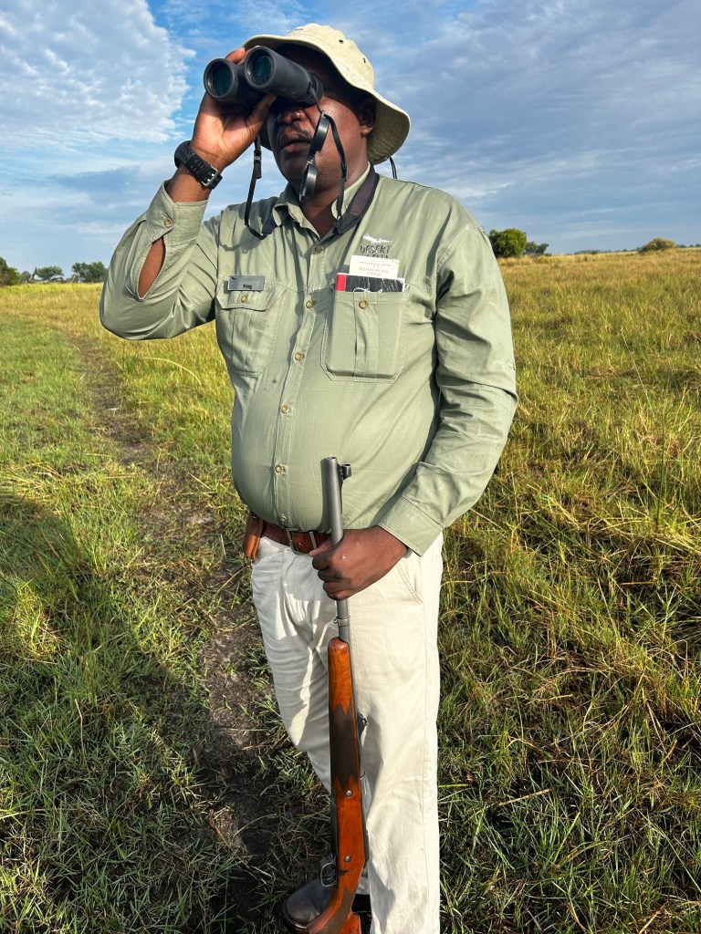 Der Tag beginnt mit einer Pirsch zu Fuß. Begleitet von zwei Rangern, gehen wir in Reihe und Glied auf Safari. King unser Guide vorn und hinter uns noch ein Guide. Nur wir vier.