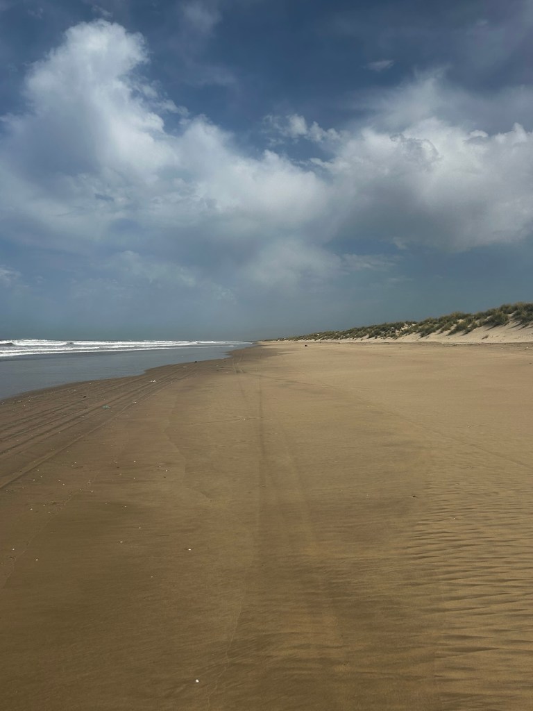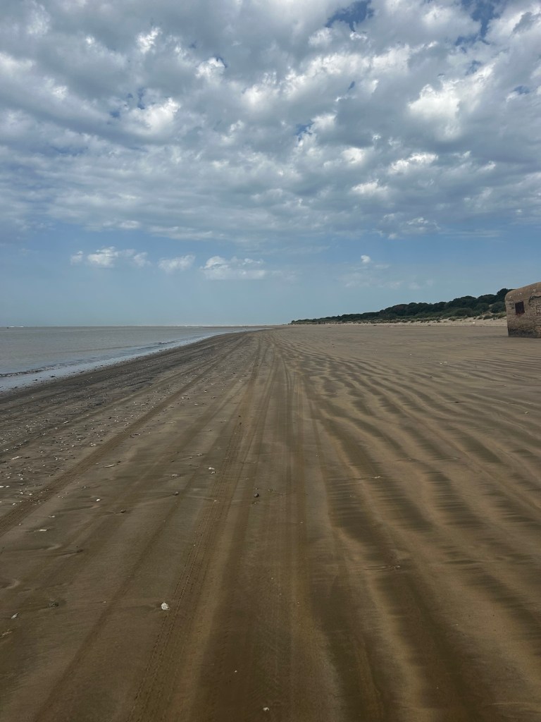 50 Euro die Butze . Aber heute gab es warmes Wasser . Morgen wird ein Hammertag. Ich muss 120 km schaffen . Ich fahre durch ein Naturschutz Gebiet ohne Städte oder so. Also viel Proviant und Ausdauer. Das Wetter soll wieder sehr stürmisch werden. Der Schiffsverkehr wurde heute und morgen eingestellt wegen des Sturmes.Leute , heute war was los . Ich habe gemütlich mit der Fähre in ein Naturschutzgebiet übersetzen lassen. Was ich nicht wusste…. Es gab keine Wege …Das war mein Schicksal …30 km Strand . Kein Ort , keine Straße , nix . Und für Sand und dünne Reifen …bin ich wieder zu schwer 😥. Also war Schieben mein Ding . Ich hatte auch nicht genug Proviant dabei. Nur 2 Äpfel 🍎 und 1 Liter Wasser . Ist nicht viel für 6 h Wanderung in der Sonne. So sieht der Spaß bei Maps aus . Nach ca. 4,5 h schieben und fluchen , wurde mir bewusst, dass das Meer immer näher kam. Die Flut holte sich immer mehr meinen Weg.